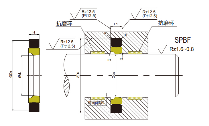 由一個(gè)帶PTFE異形截面滑環(huán)和一個(gè)作為預(yù)加載元件的矩形圈組成的雙組合密封件。特別適合用于用作較大活塞桿直徑和工況條件十分苛刻的重載荷液壓缸活塞桿密封系統(tǒng)。例如用在注塑機(jī)、冶金機(jī)械、船用液壓設(shè)備、液壓機(jī)、工程機(jī)械、起重機(jī)、液壓控制系統(tǒng)等。