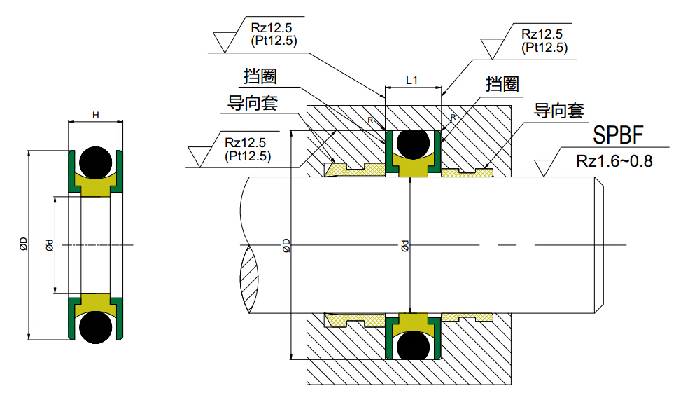 RDI由一個密封環(huán)、兩個L型POM(直徑Ф400mm以上用PA)支撐環(huán)和一個施力的O形圈組成活塞桿組合密封。支撐環(huán)起支撐和引導(dǎo)作用,以確保緊密的密封環(huán)境。密封環(huán)依靠O圈的施力緊壓活塞桿,提供密封作用??稍诘V物油,水基潤滑液、改性水基潤滑液和其他液體中使用。