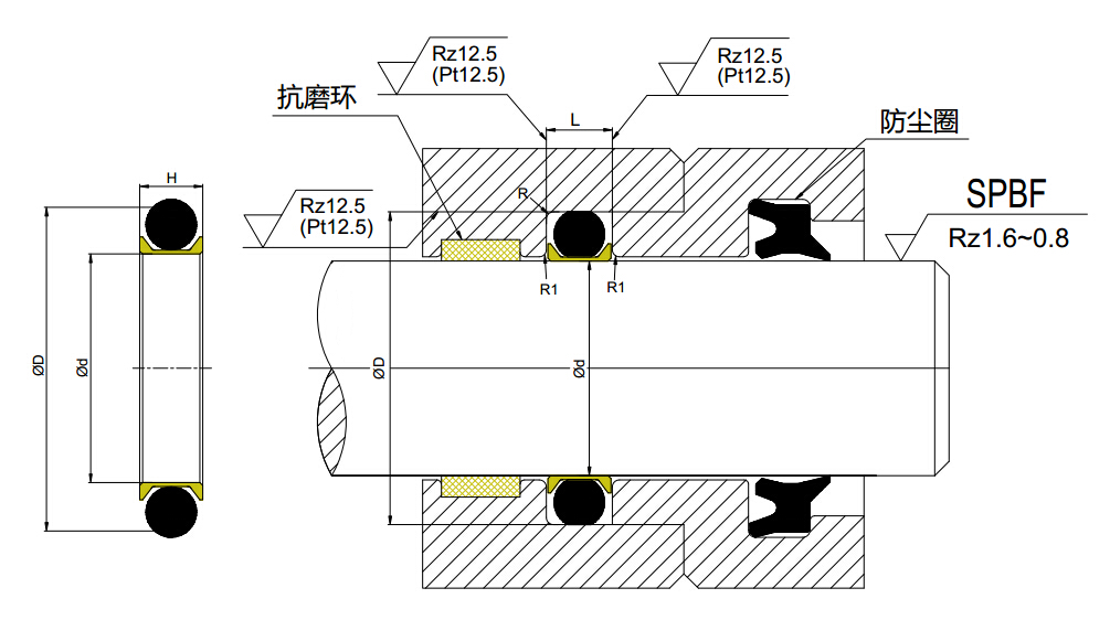 滑動材料用填充聚四氟乙烯,此密封件具有很低的摩擦阻力,消除了爬行,確保有很高的耐磨性。因單個密封件有雙向密封能力,故省去了安裝空間。此密封件可裝在O形圈槽上,比O形圈有較低的滑動摩擦以保證有很高的耐用性,還可以用于氣動設備。