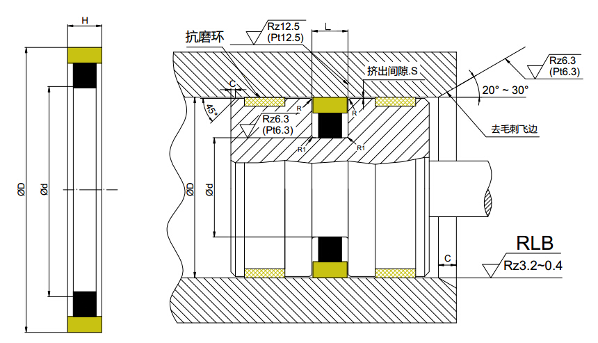 滑動材料用填充聚四氟乙烯,此密封件具有很低的摩擦阻力,消除了爬行,確保有很高的耐磨性。因單個密封件有雙向密封能力,故省去了安裝空間。