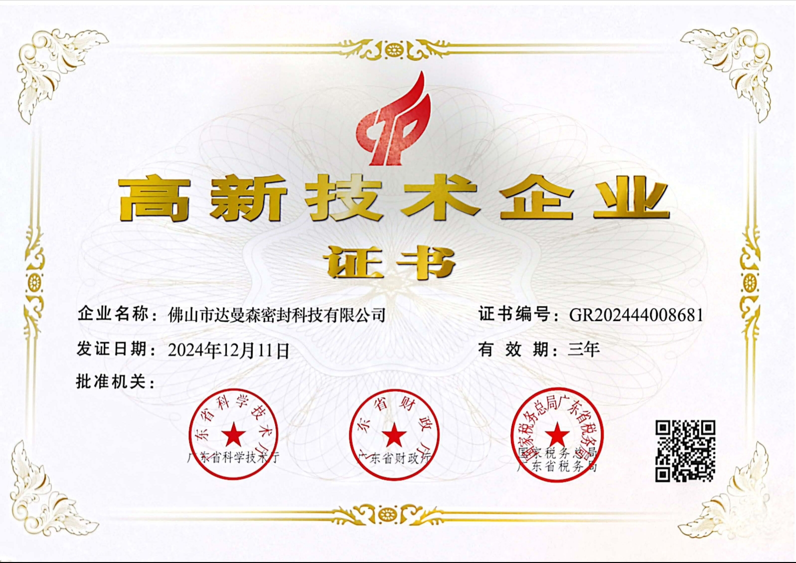 近日,佛山市達(dá)曼森密封科技有限公司再次榮獲由廣東省科學(xué)技術(shù)廳、廣東省財(cái)政廳、國家稅務(wù)總局廣東省稅務(wù)局聯(lián)合頒發(fā)的2024年國家級(jí)高新技術(shù)企業(yè)證書。達(dá)曼森密封于2018年首次通過國家高新企業(yè)認(rèn)證,這一次是第三次獲得該項(xiàng)殊榮。