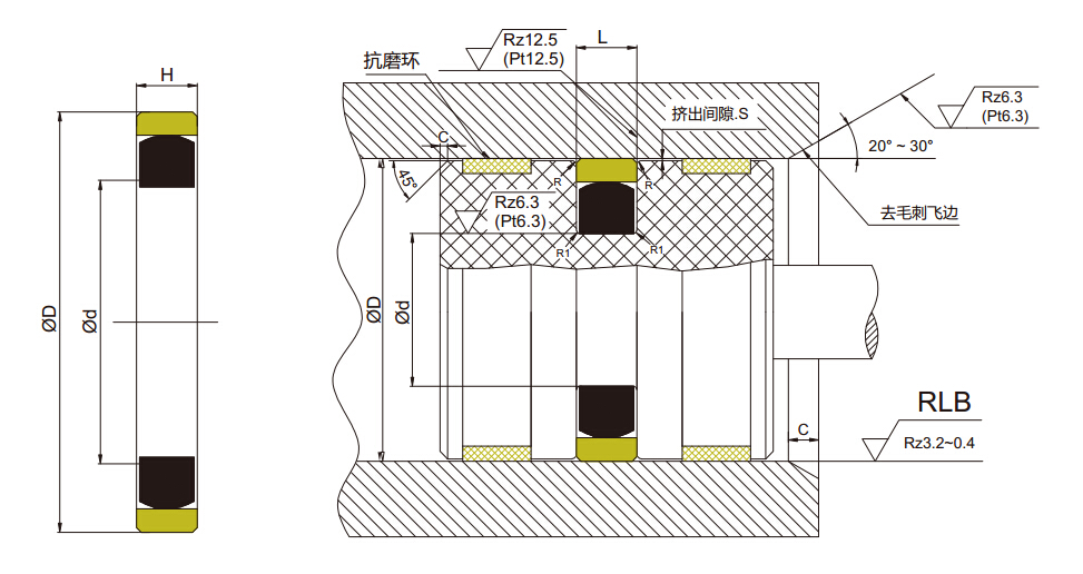 由一個PTFE矩形截面滑環(huán)和一個作為加載元件的矩形圈組成的雙組合密封圈。此種型式的同軸密封,主要用于重型機械或冶金設(shè)備的液壓缸活塞密封系統(tǒng)。如:液壓機、注塑機等。